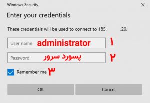 در این مرحله ریموتدسکتاپ یوزرنیم و پسورد سرور را از شما میخواهد.