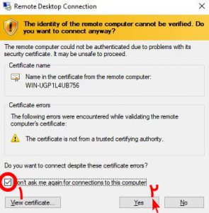 در این قسمت remotedesktop خطایی مبنی بر معتبر نبودن certificate به شما میدهد. این خطا از نظر فنی اهمیتی ندارد. تیک گزینه Dont ask me again for connections to this computer را میزنیم تا دفعات بعد این پنجره را به ما نمایش ندهد.